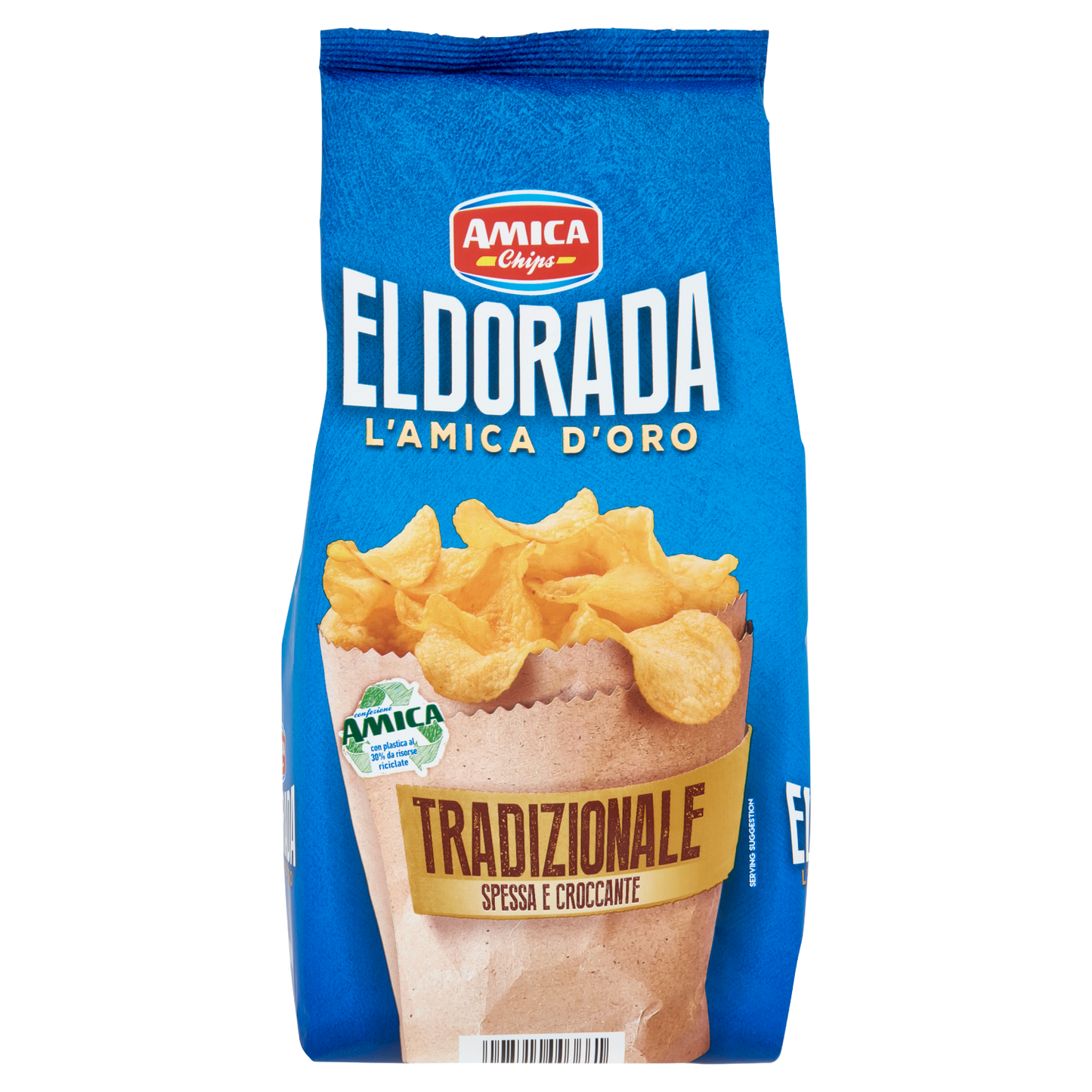 AMICA CHIPS PATATINE ELDORADA CLASSICA offers a classic potato chip experience in a convenient 130g pack, with 15 packs per box. These chips deliver a balanced, crispy texture and authentic potato flavor, ideal for snacking or sharing. Perfectly portioned, they maintain freshness and quality, making them a reliable choice for both casual enjoyment and professional catering needs.