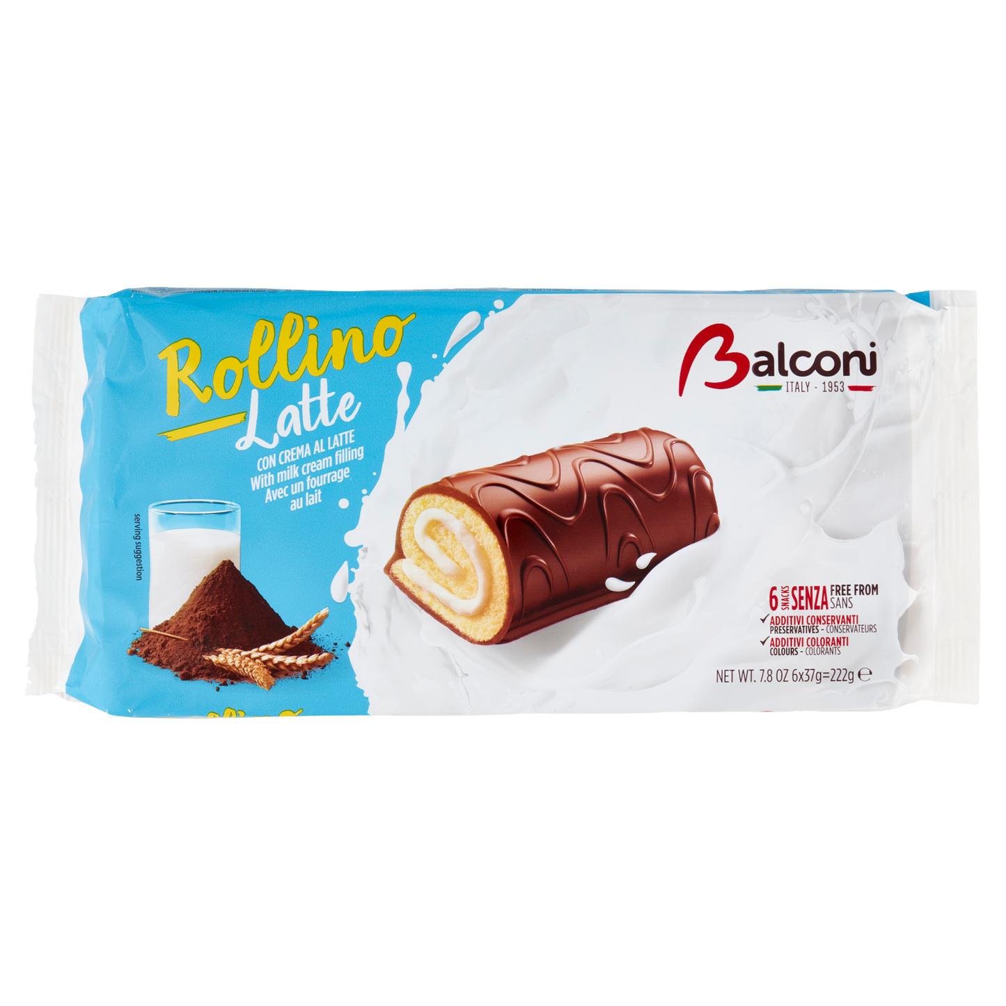 Balconi Rollino Latte X6 offers six individually wrapped creamy milk-flavored rolls, each weighing 222g. Perfect for portion control and convenient snacking, these rolls combine soft sponge cake with a smooth milk filling, delivering a balanced taste experience. Ideal for on-the-go enjoyment or as a delightful addition to coffee breaks, this pack of 20 boxes ensures freshness and consistent quality for retail or catering needs.
