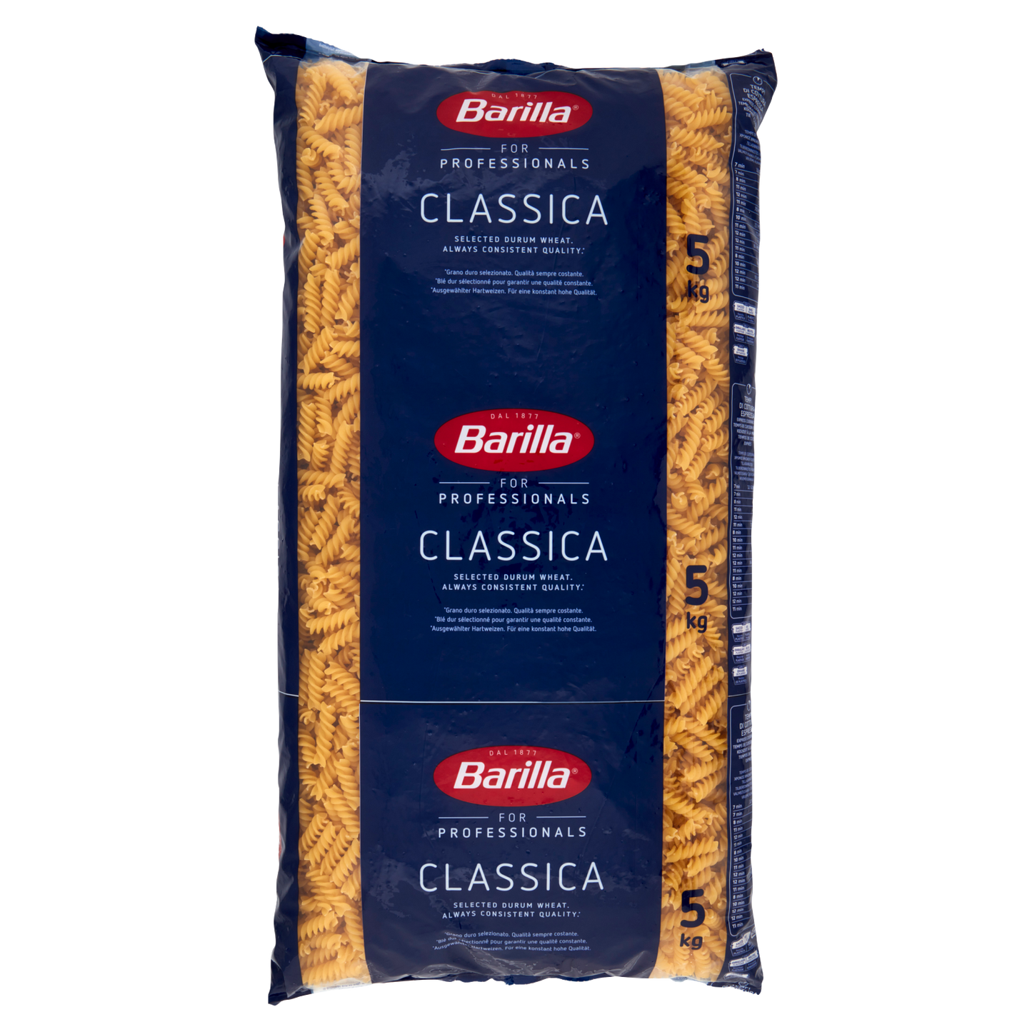 Barilla Pasta di Semola Fusilli in a 5kg pack (3 in box) offers premium-quality durum wheat semolina pasta, ideal for professional kitchens and large-scale catering. Its firm texture and excellent cooking performance ensure consistent results, making it perfect for a variety of sauces and dishes. This bulk packaging provides convenience and value for chefs seeking reliable pasta with authentic Italian quality.