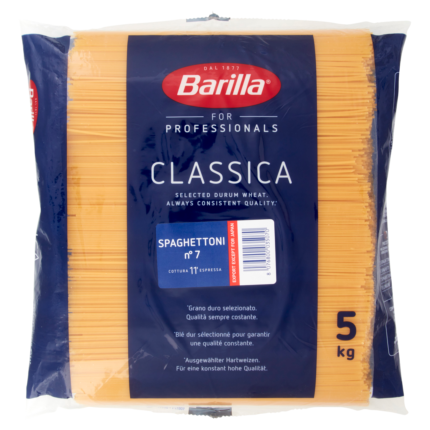 Barilla Pasta Semola Spaghettoni N.7 offers a premium-quality durum wheat semolina pasta, ideal for creating authentic Italian dishes. Its thick, robust strands hold sauces exceptionally well, enhancing flavor and texture in every bite. Packaged in a convenient 5kg size with three boxes, it suits both professional kitchens and serious home cooks seeking consistent, high-standard pasta for large servings.