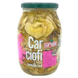 Carbone Carciofi a Fette Semidried offers 950g of premium semi-dried artichoke slices, carefully preserved to maintain their rich flavor and tender texture. Ideal for gourmet cooking, these artichokes enhance dishes with their concentrated taste and versatility. Packaged in a box of six, they provide consistent quality and convenience for professional kitchens and culinary enthusiasts alike.