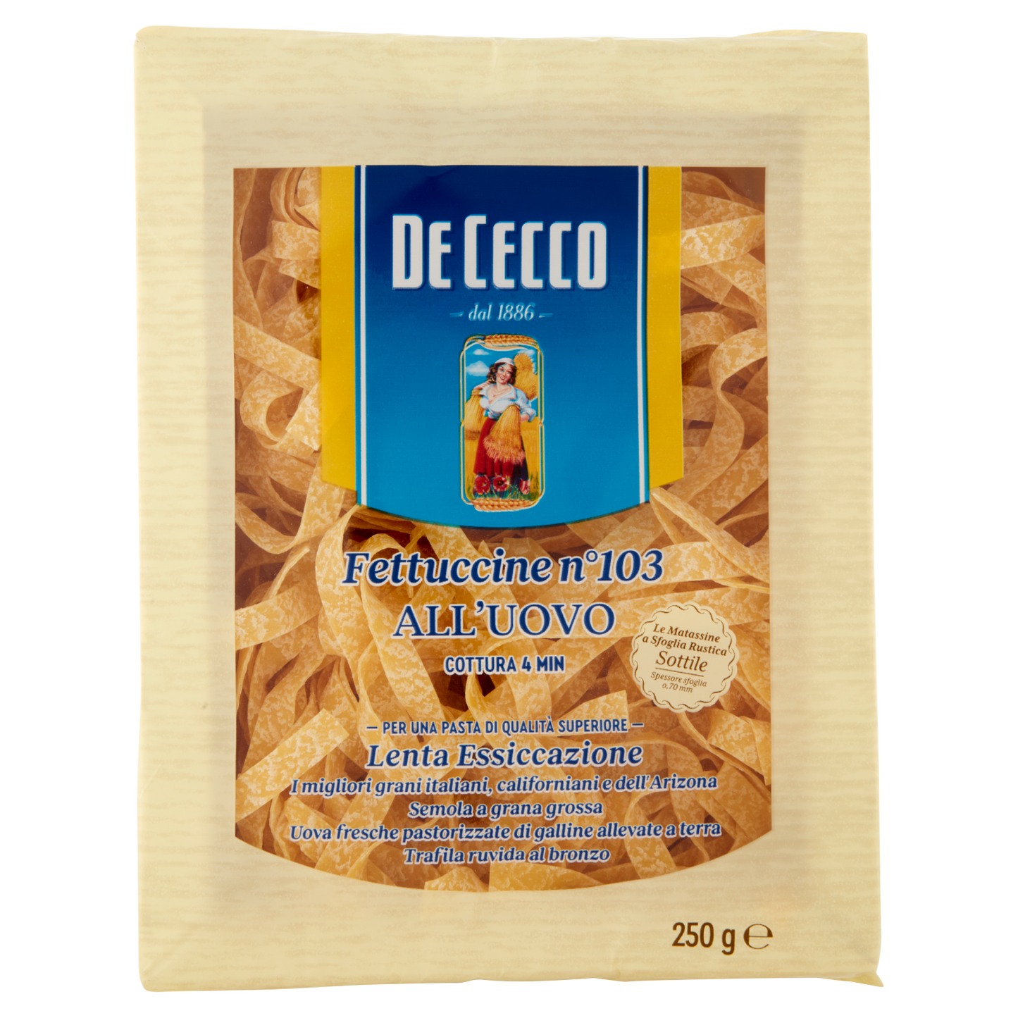 DE CECCO FETTUCCINE N°103 ALL'UOVO 250g offers a premium pasta experience crafted with high-quality durum wheat and fresh eggs. This traditional Italian fettuccine delivers a firm texture and rich flavor, ideal for absorbing sauces and enhancing your culinary creations. Perfect for both classic and innovative dishes, it ensures consistent cooking results and authentic taste in every bite. Packaged in 250g portions, with 12 boxes available, it suits professional kitchens and pasta enthusiasts seeking excellence.
