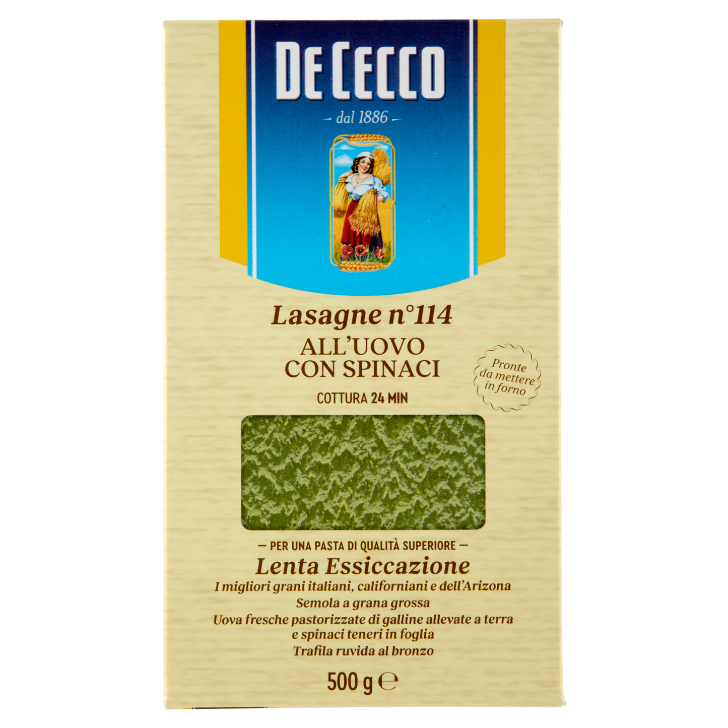 De Cecco Lasagne Spinaci 500g offers a premium pasta experience, crafted with high-quality durum wheat and enriched with spinach for a subtle, natural flavor and vibrant color. Ideal for layered dishes, this lasagne provides excellent texture and firmness, ensuring perfect cooking results every time. Its balanced composition enhances both traditional and creative recipes, making it a reliable choice for chefs seeking consistent quality and taste in their culinary creations. Packaged in a convenient 500g size, it is suitable for both professional kitchens and home cooking.