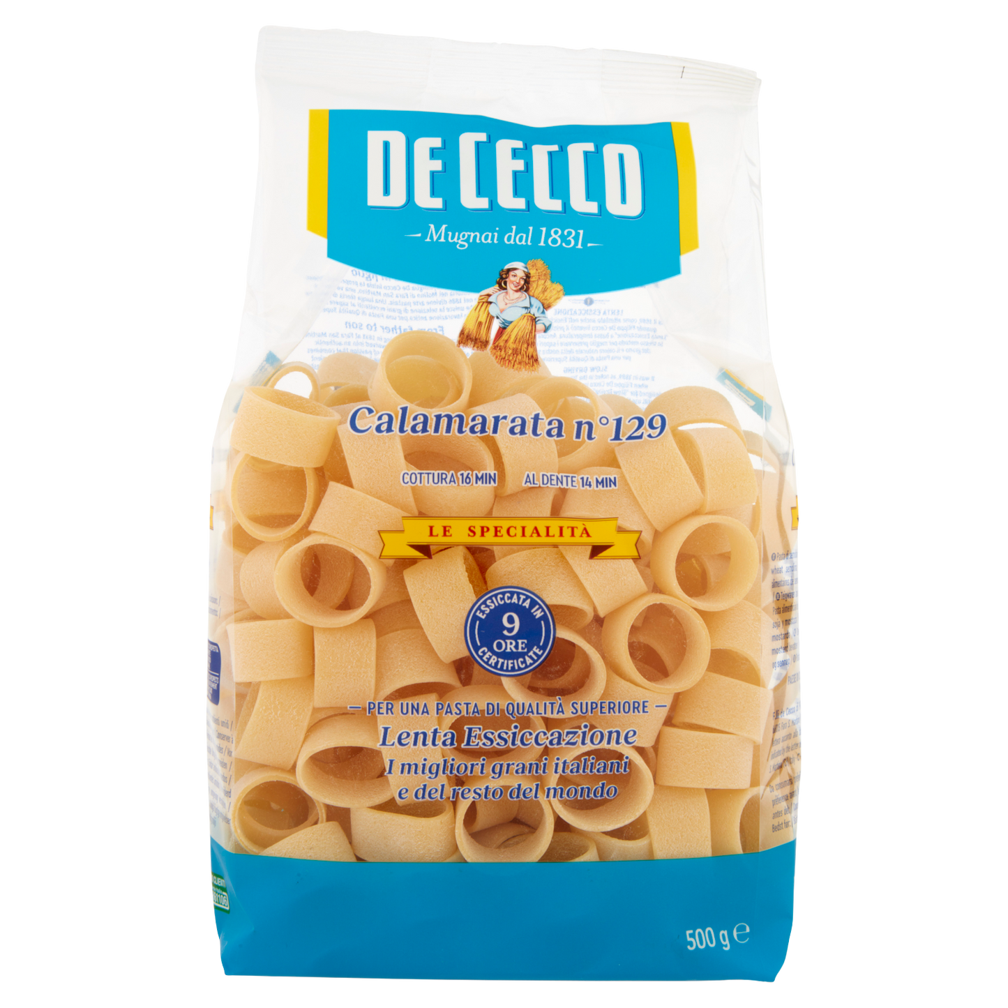 DE CECCO LE SPECIALITA' CALAMARATA N°129 offers a distinctive pasta shape inspired by traditional Italian cuisine. This 500g package, available in a box of 12, is crafted to hold sauces perfectly, enhancing every dish with authentic texture and flavor. Ideal for chefs seeking quality and versatility, it elevates your culinary creations with genuine Italian craftsmanship.
