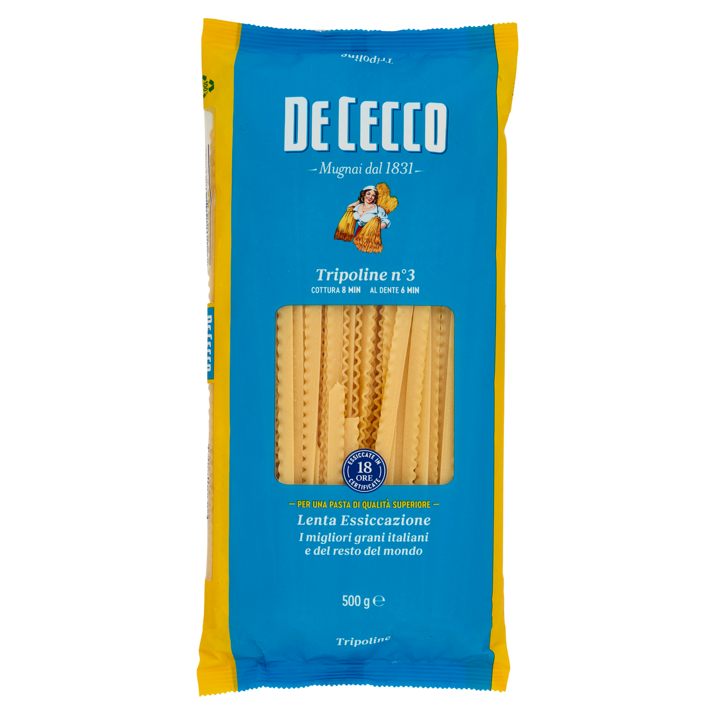 DE CECCO LE SPECIALITA' TRIPOLINE N.3 500g offers a premium pasta experience with its distinctive twisted shape, ideal for capturing rich sauces. Crafted from high-quality durum wheat semolina, this 500g pack ensures consistent texture and al dente cooking. Perfect for gourmet dishes, it delivers authentic Italian flavor and superior cooking performance, making it a staple for culinary professionals and enthusiasts alike. Available in a box of 24, it suits both commercial kitchens and serious home cooks seeking excellence in every bite.