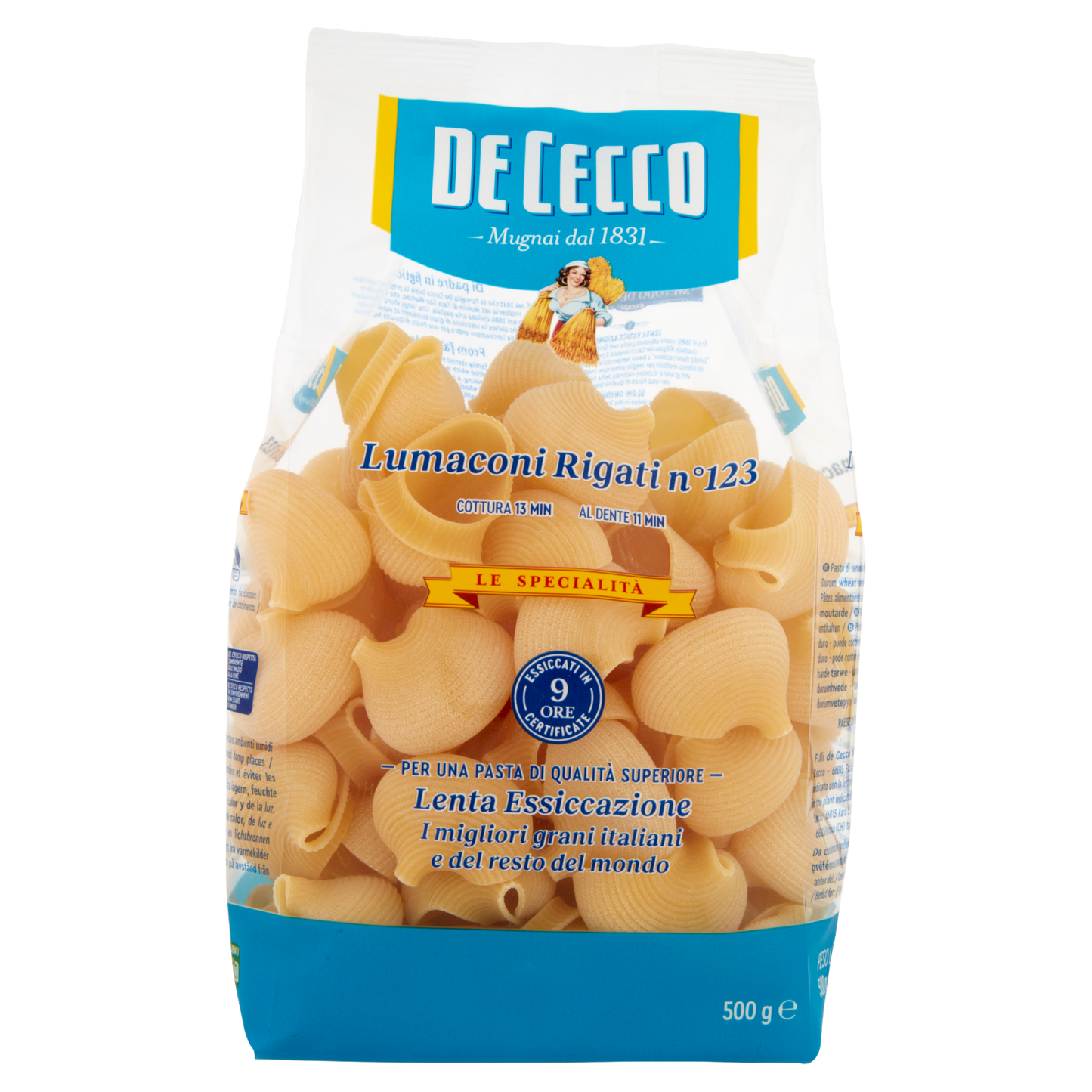 De Cecco Lumaconi Rigati N.123 offers a premium pasta experience with its large, ridged shell shape designed to hold rich sauces perfectly. Made from high-quality durum wheat semolina, this 500g pack (12 per box) ensures consistent texture and al dente cooking. Ideal for gourmet recipes, its robust structure enhances flavor absorption, making it a versatile choice for sophisticated culinary creations.