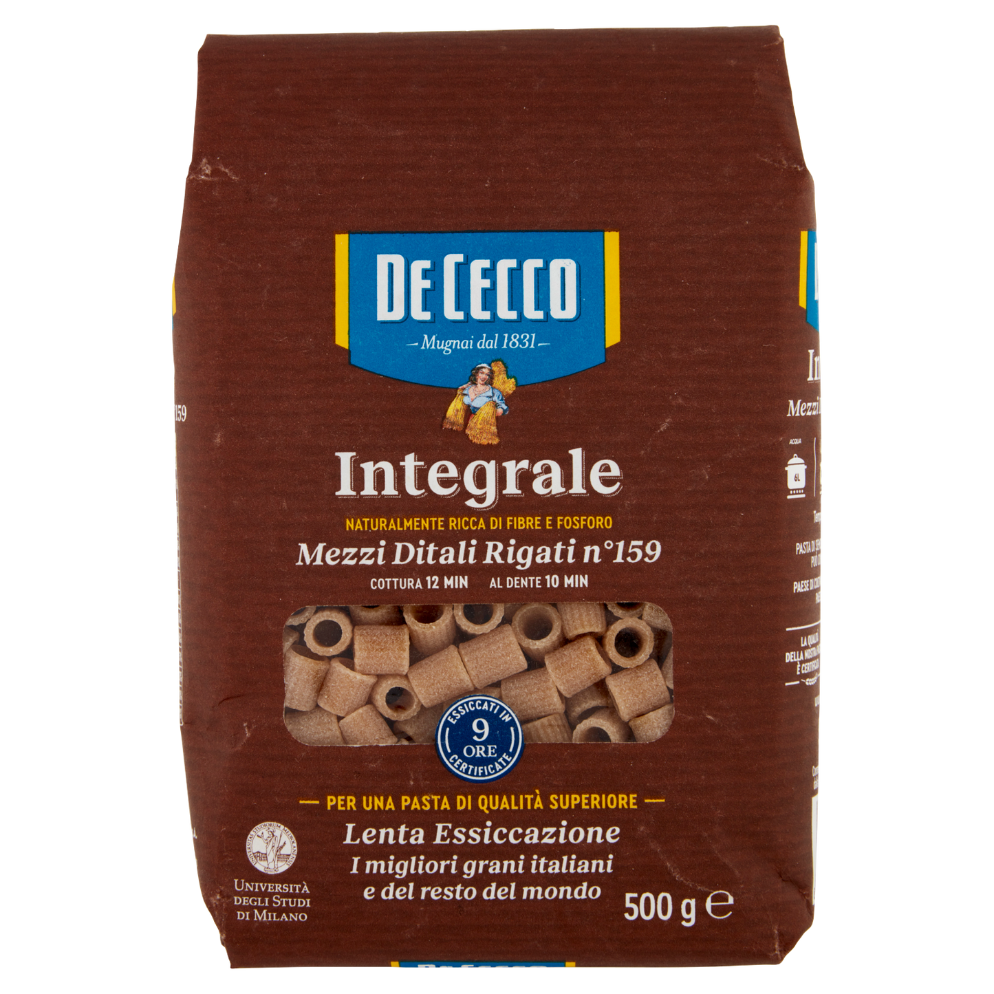 DE CECCO Mezzi Ditali Rigati N°159 Integrale offers a wholesome twist on a classic pasta shape, crafted from whole wheat for added fiber and nutrients. Each 500g pack delivers a robust texture that holds sauces beautifully, making it ideal for hearty, nutritious meals. Sold in boxes of 16, this pasta is perfect for both professional kitchens and home chefs seeking quality and consistency in every dish.
