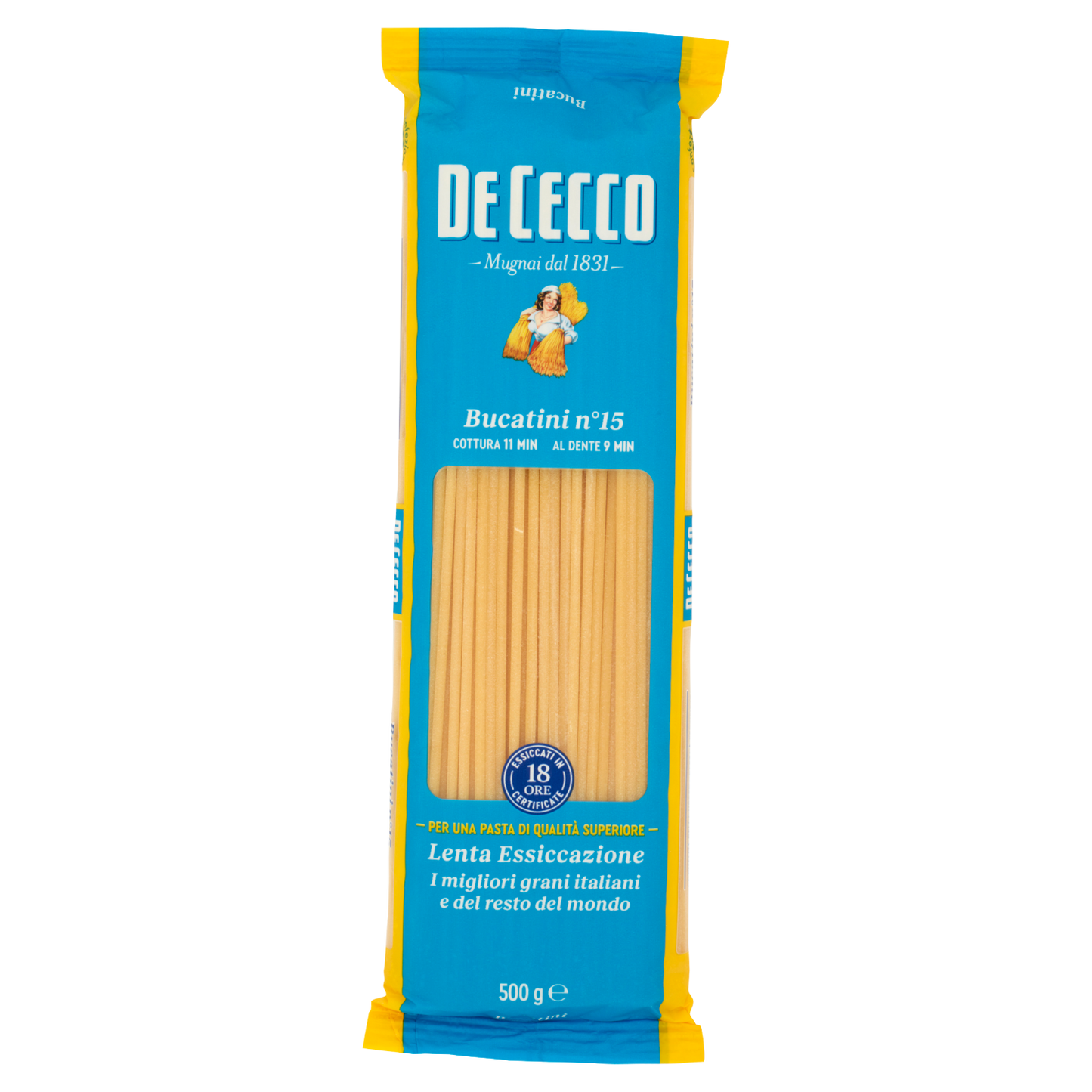DE CECCO Bucatini N°15 is a premium semolina pasta known for its firm texture and excellent cooking performance. Made from high-quality durum wheat semolina, this 500g pack delivers authentic Italian taste and al dente consistency. Ideal for traditional recipes, its hollow shape allows sauces to cling perfectly, enhancing every bite. Sold in a box of 24, it’s perfect for professional kitchens or bulk use.