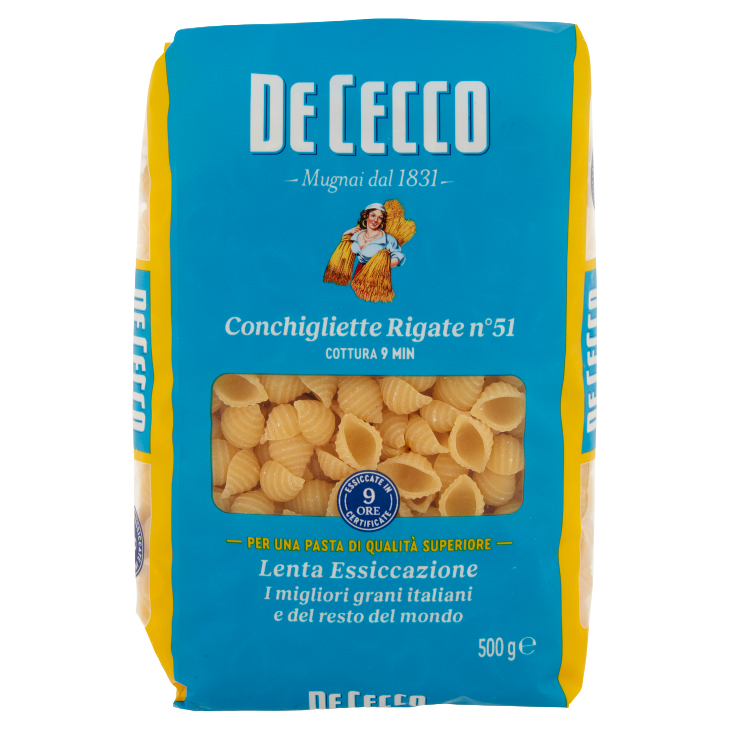 DE CECCO Pasta di Semola Conchigliette Rigate offers a premium quality pasta made from durum wheat semolina. Its small, ridged shell shape is ideal for capturing sauces, enhancing every bite with rich flavor. Perfect for expert chefs seeking authentic Italian texture and taste, this 500g pack (24 per box) ensures consistent quality for professional kitchens and culinary creations.