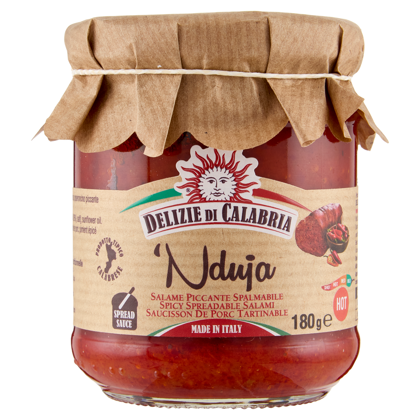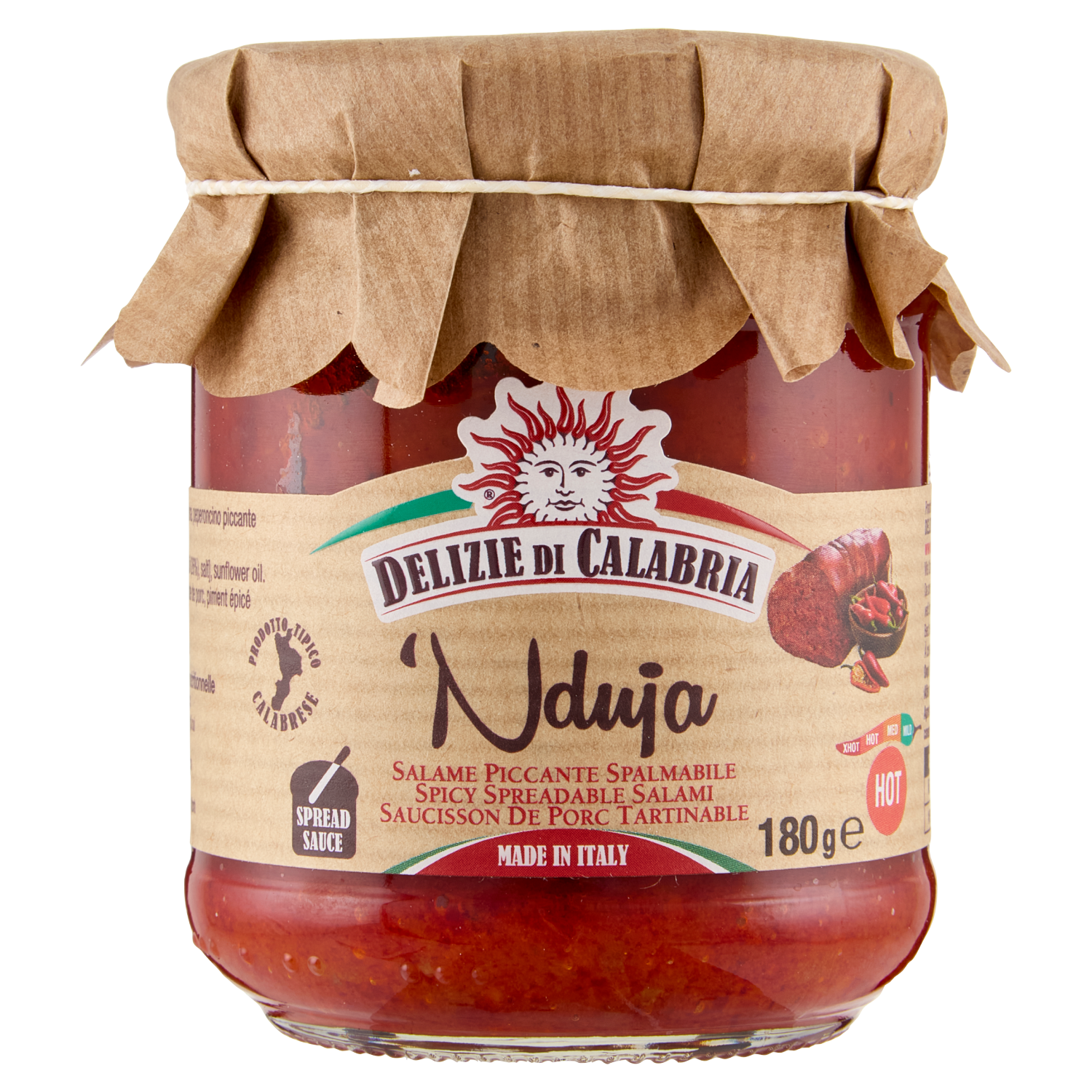 Delizie Calabria Nduja with sunflower seed oil is a traditional spicy spread from Calabria, Italy, presented in a 180g jar. Crafted with high-quality ingredients, it offers a rich, smoky flavor balanced by the lightness of sunflower oil. Ideal for enhancing dishes with authentic Mediterranean heat and depth, this nduja is perfect for chefs and food enthusiasts seeking to add a distinctive, expert touch to their culinary creations. Sold in boxes of 12, it ensures consistent quality and supply for professional kitchens.