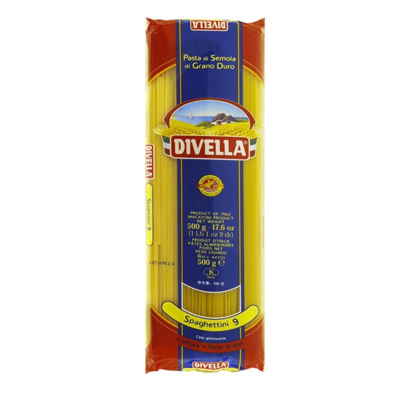 Crafted from high-quality durum wheat semolina, DIVELLA Spaghettini N.9 offers a delicate, thin pasta ideal for light sauces and refined dishes. Each 500g pack ensures consistent texture and al dente cooking, making it a reliable choice for culinary professionals seeking authentic Italian pasta with excellent cooking performance. Available in bulk boxes of 36, it suits both commercial kitchens and serious home cooks.