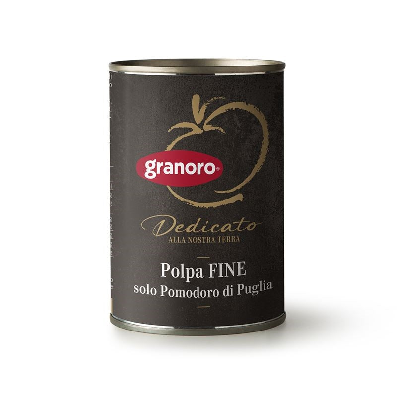 Granoro Dedicato Polpa Fine 400g offers finely chopped tomatoes ideal for authentic Italian cooking. Packaged in a convenient 400g size and available in a box of 24, it ensures consistent quality and flavor for professional kitchens and foodservice operations. This product delivers a smooth texture and rich tomato taste, perfect for sauces, soups, and stews, enhancing your culinary creations with genuine Italian ingredients.