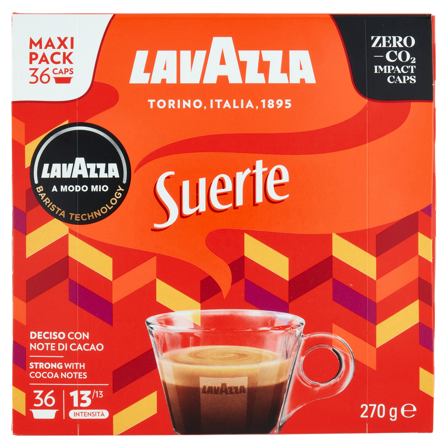 LAVAZZA A MODO MIO SUERTE offers a rich and balanced coffee experience in convenient 36-capsule packs, each weighing 270g. Designed for use with Lavazza A Modo Mio machines, these capsules deliver a smooth blend with intense aroma and a lasting finish. Ideal for coffee enthusiasts seeking consistent quality and authentic Italian flavor in every cup. The packaging of 10 boxes ensures ample supply for both home and office use.
