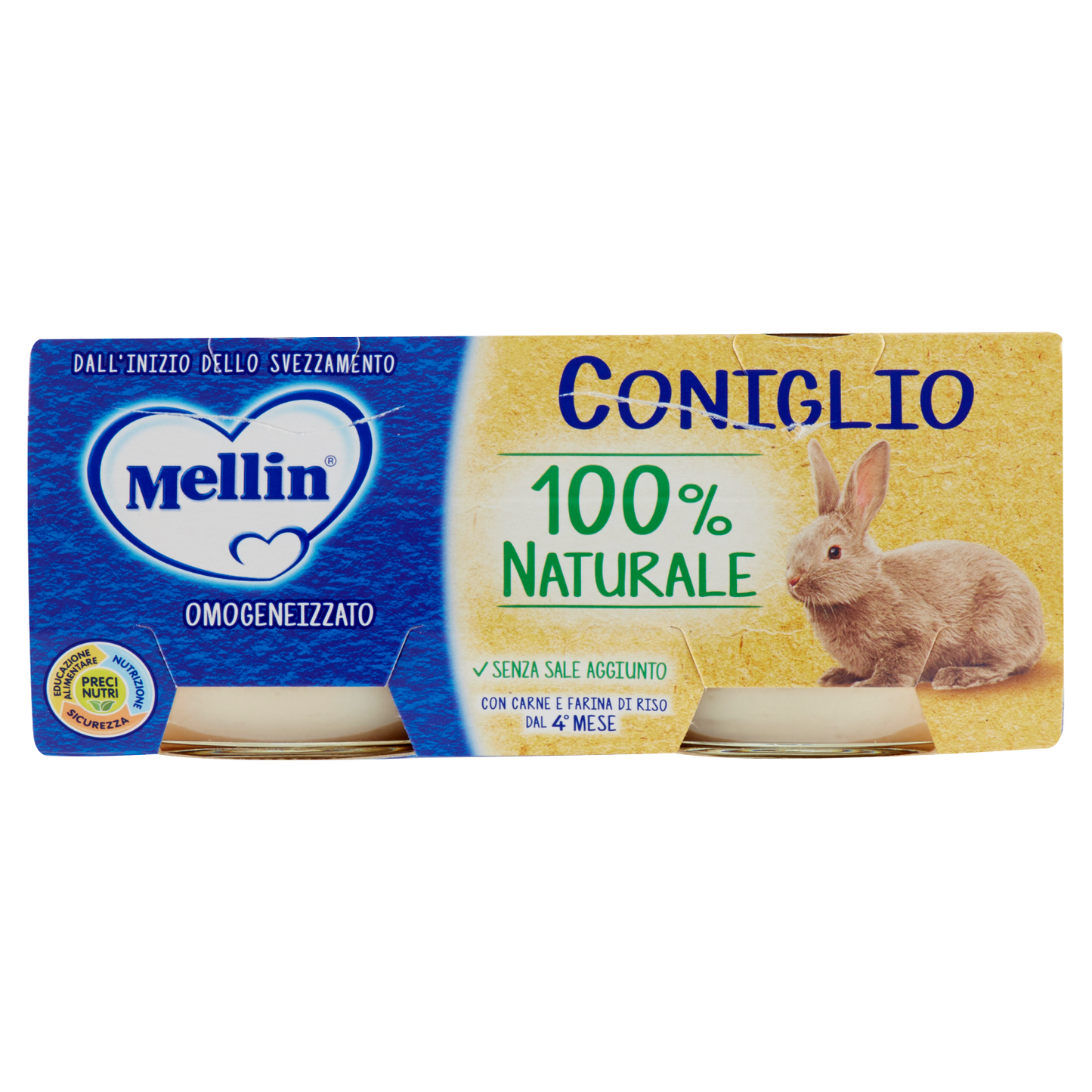 Mellin Omogeneizzato Coniglio offers a carefully prepared rabbit puree, ideal for introducing your baby to new flavors and nutrients. Each pack contains two 80g portions, ensuring freshness and convenience. This product supports your child's balanced diet with high-quality protein from rabbit meat, known for its digestibility and nutritional value. Perfectly portioned and easy to serve, it helps provide a varied and wholesome meal for your little one.