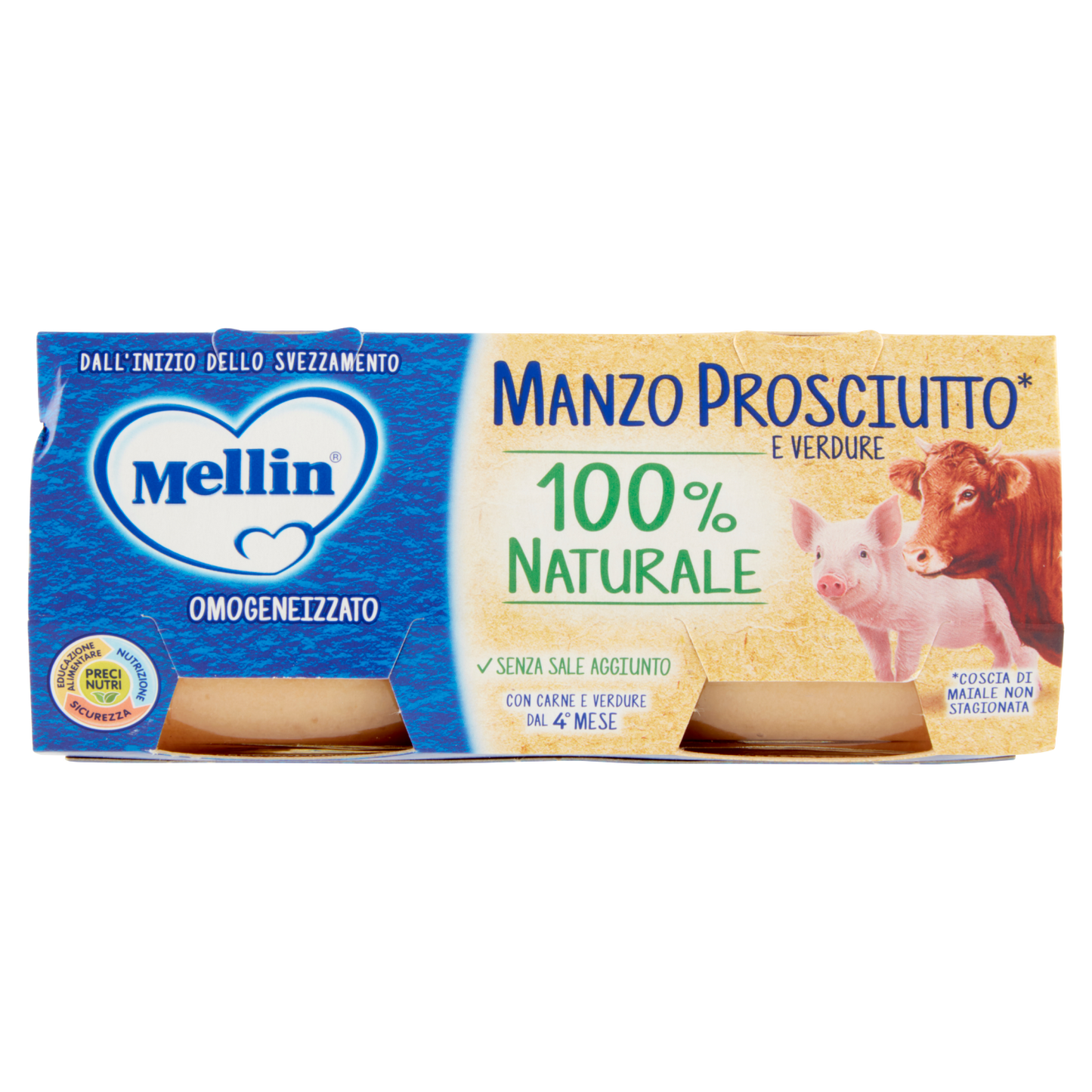 Mellin Omogeneizzato Manzo e Prosciutto offers a carefully balanced blend of beef and ham in a convenient 80g x 2 pack, totaling 160g. Designed for infants transitioning to solid foods, this product provides essential proteins to support healthy growth and development. Its smooth texture ensures easy digestion, making mealtime both nutritious and comfortable for your baby. Packaged in a box of 12, it’s ideal for consistent feeding routines.