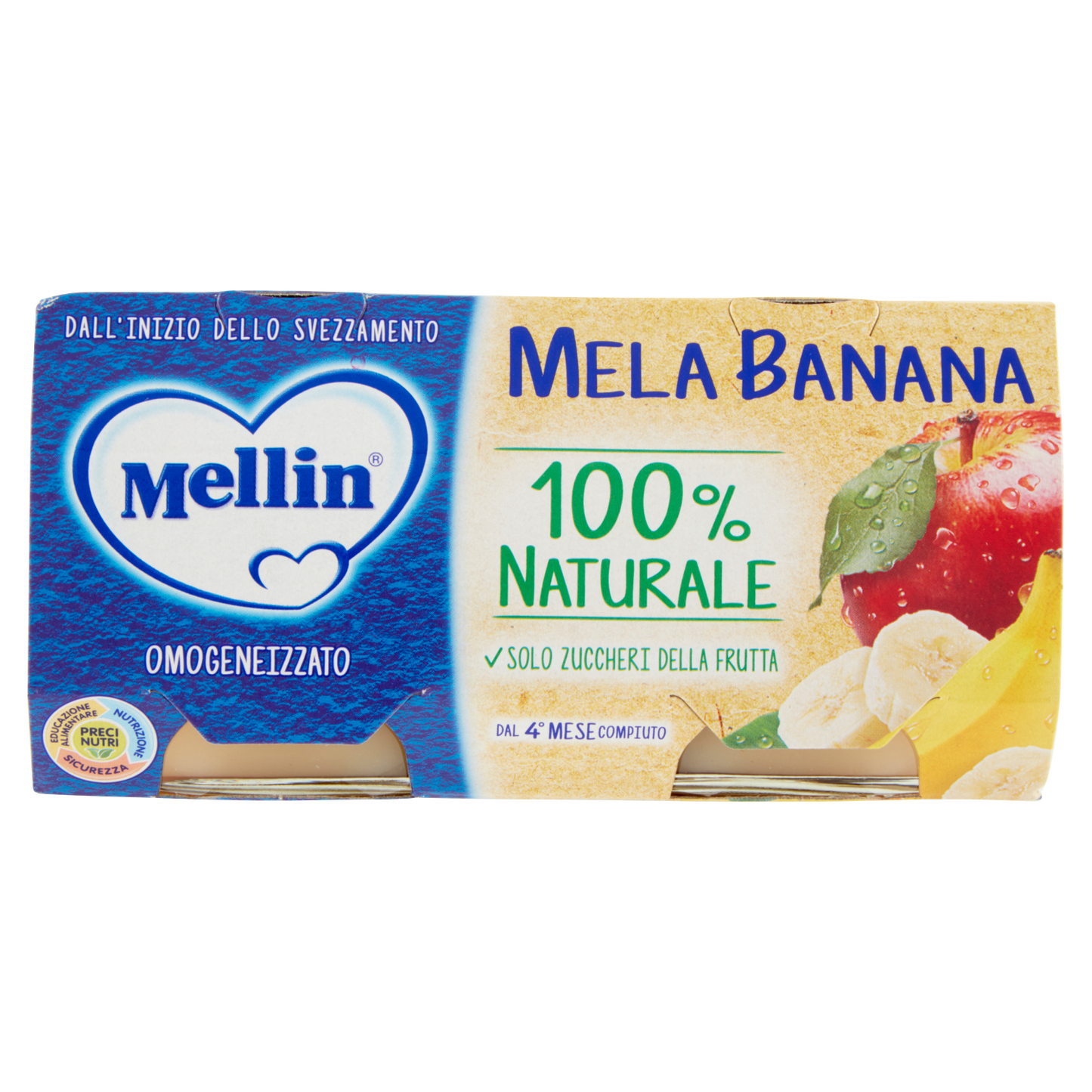 Mellin Omogeneizzato Mela e Banana offers a carefully blended fruit puree combining the natural sweetness of apples and bananas. Each 100g pack provides a smooth texture ideal for infants beginning their weaning journey. Sold in convenient packs of two, with 12 boxes available, this product ensures freshness and quality, supporting balanced nutrition during early development stages.