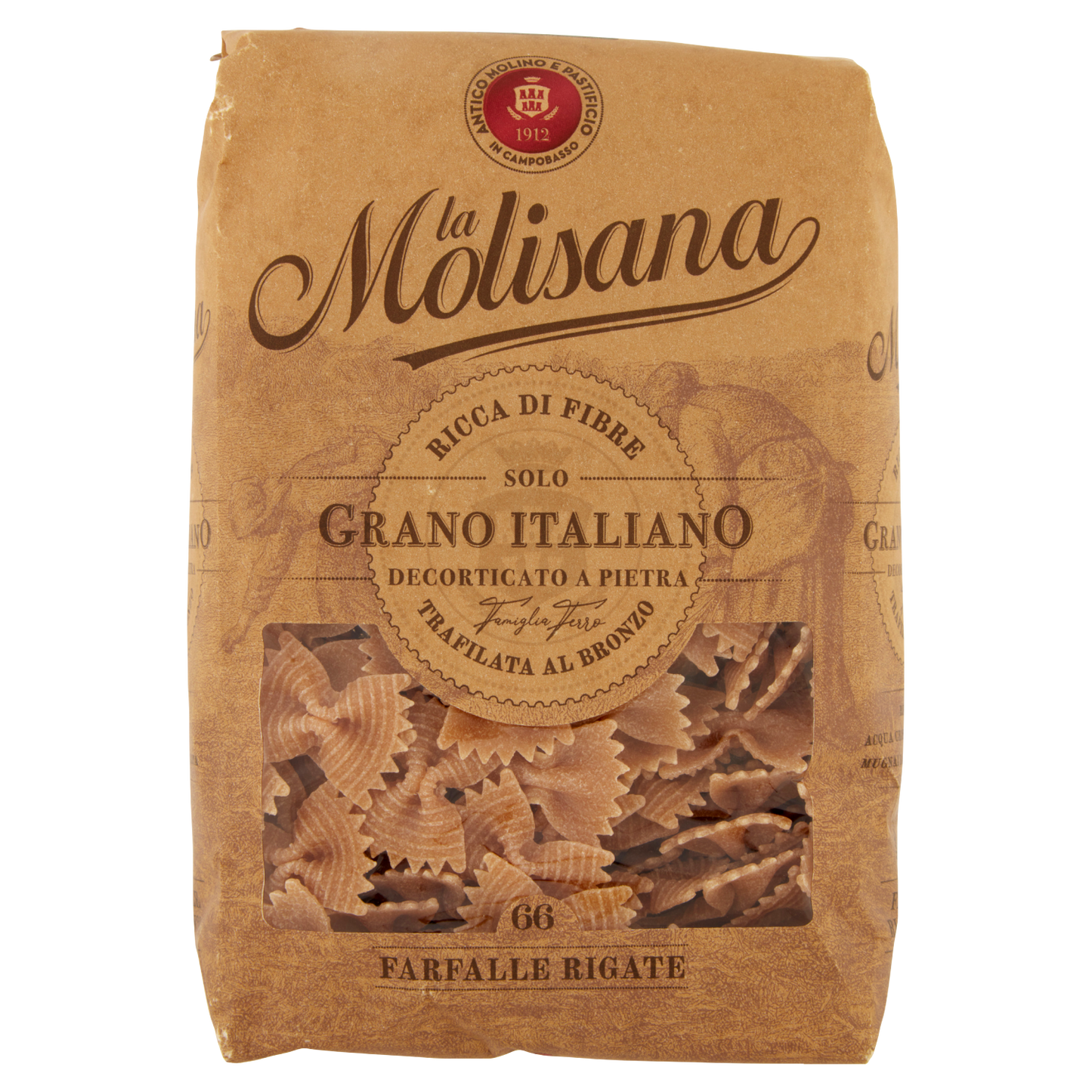 MOLISANA FARFALLE N°66 INTEGRALI offers a premium whole wheat pasta experience with a 500g pack size, ideal for authentic Italian cooking. Made from high-quality whole grain durum wheat, these farfalle deliver a firm texture and rich flavor while providing added dietary fiber. The distinctive bow-tie shape ensures even sauce absorption, enhancing your culinary creations. Sold in convenient 12-pack boxes, this product is perfect for both professional kitchens and serious pasta enthusiasts seeking nutritional value alongside superior taste.