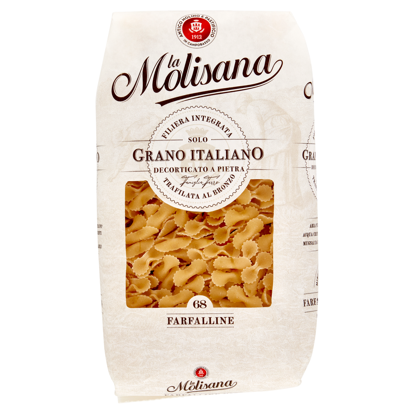 Molisana Farfalline N.68 offers perfectly crafted small bow-tie pasta made from high-quality durum wheat semolina. Its delicate shape and firm texture ensure excellent sauce adherence, making it ideal for light sauces, salads, and soups. Packaged in 500g for convenient portioning, this product comes in cases of 24 to meet professional kitchen demands efficiently. Perfect for chefs seeking consistency and premium Italian pasta authenticity.