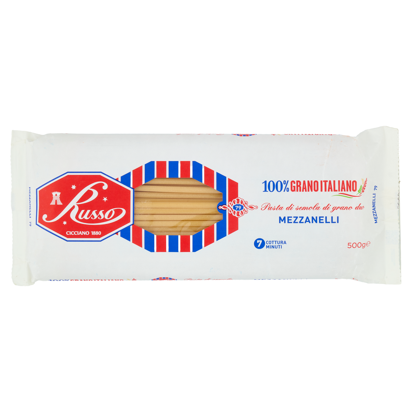 RUSSO FORMATI SPECIALI MEZZANELLI 500g offers a distinct shape ideal for capturing sauces and enhancing texture in pasta dishes. Packaged in a box of 20, this quality pasta is perfect for professional kitchens and catering, providing consistency and ease of portioning. Its firm structure ensures it holds up well during cooking, making it a reliable choice for various recipes requiring a sturdy yet delicate pasta form.