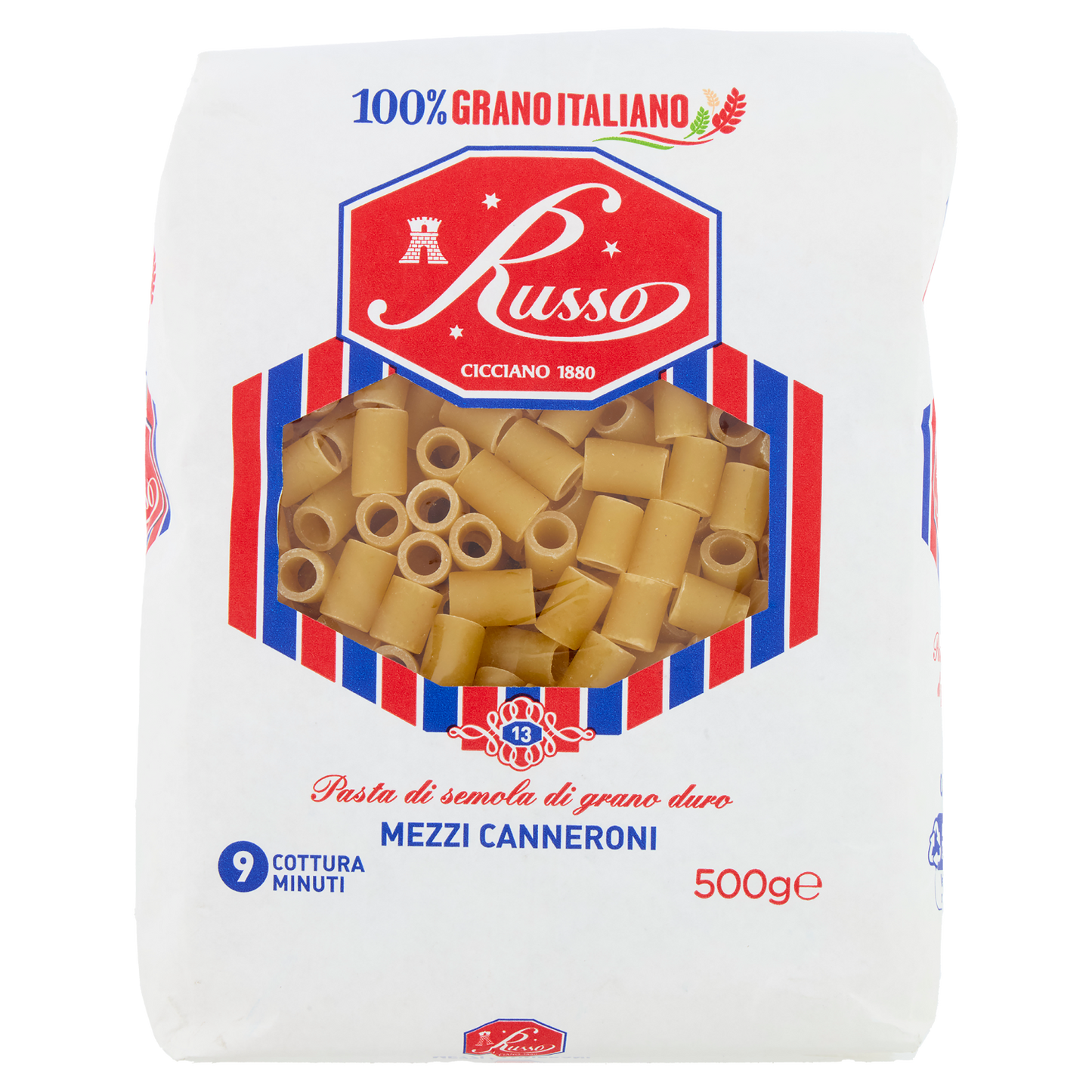 RUSSO Pasta di Semola Mezzi Cannoni offers authentic Italian quality with its 500g pack, containing 20 pieces per box. Made from high-quality semolina, this pasta features a firm texture ideal for holding rich sauces, enhancing the overall dining experience. Perfect for both professional kitchens and home chefs seeking genuine Italian flavor and consistency in their pasta dishes.