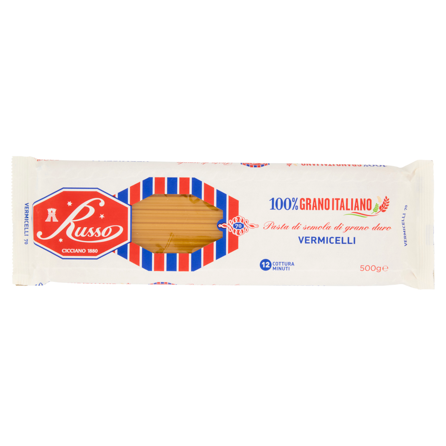 RUSSO Pasta di Semola Vermicelli 500g offers a premium-quality durum wheat semolina pasta, known for its firm texture and excellent cooking performance. Ideal for creating delicate and authentic Italian dishes, these vermicelli strands hold sauces well and maintain their shape without becoming mushy. Each 500g pack ensures consistent portioning, perfect for both home chefs and professional kitchens seeking refined pasta options. Delivered in a box of 24, this product supports bulk use while preserving freshness and quality.
