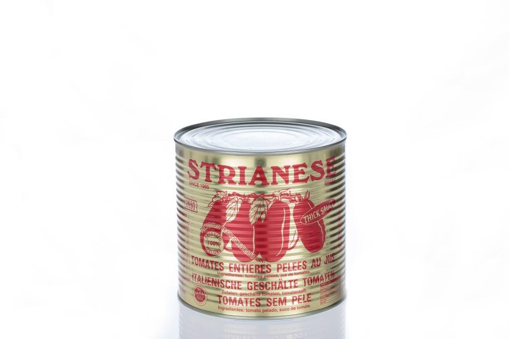 STRIANESE POMODORI PELATI come in a 2.5kg pack, with six cans per box, offering high-quality peeled tomatoes ideal for professional kitchens. Their rich flavor and consistent texture make them perfect for sauces, stews, and a variety of traditional recipes, ensuring reliable results for culinary experts seeking authentic Italian ingredients.