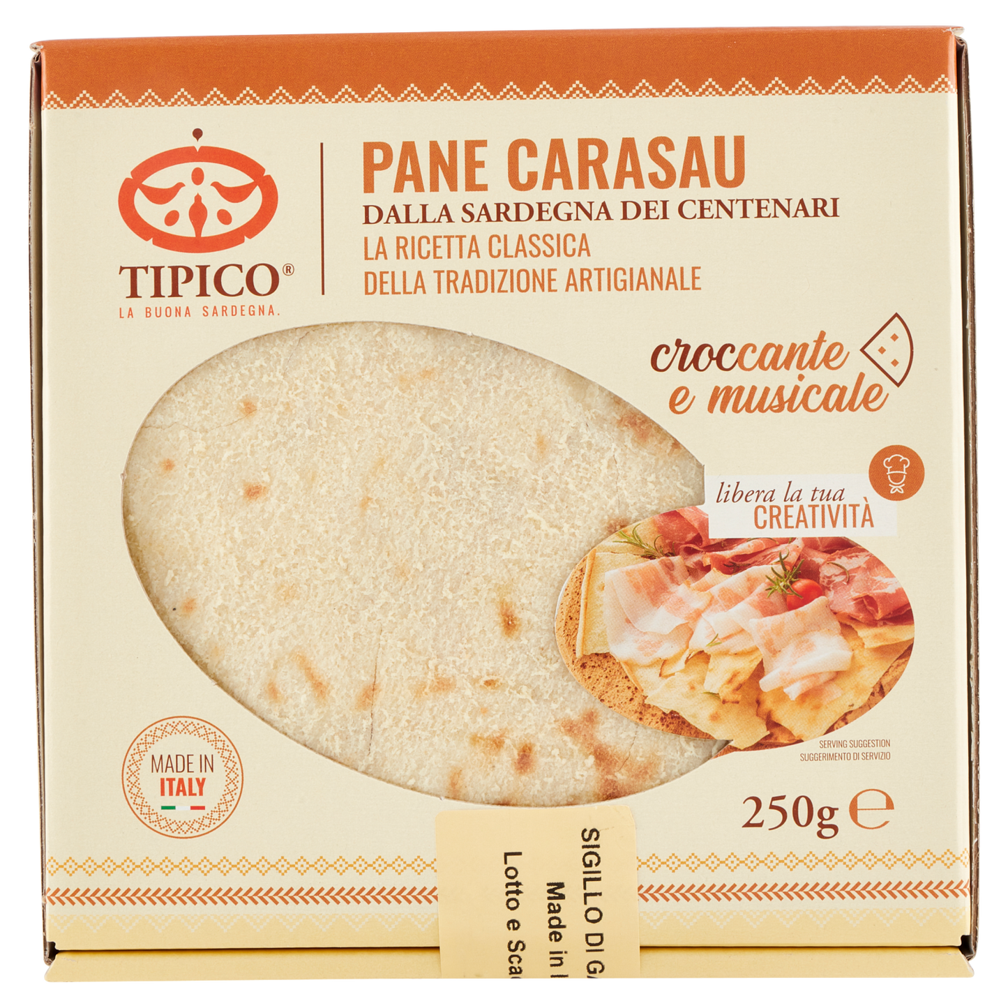 TIPICO Pane Carasau is a traditional Sardinian flatbread known for its thin, crisp texture. Each 250g package contains 20 individually baked sheets, perfect for authentic Mediterranean dishes or as a versatile accompaniment. Its light, crunchy quality makes it ideal for layering with cheeses, meats, or vegetables, enhancing both flavor and presentation with expert culinary finesse.