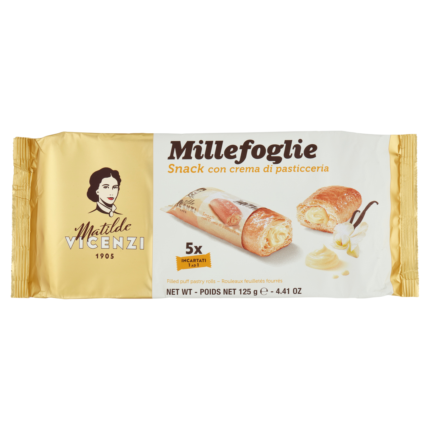 VICENZI Millefoglie Minisnack Crema Pasticcera offers a delicate balance of flaky pastry layers filled with smooth custard cream. Each 125g pack contains five individually wrapped snacks, ideal for portion control and freshness. Perfect for on-the-go indulgence or as a refined accompaniment to coffee or tea, these mini pastries combine traditional Italian baking expertise with convenient packaging. Available in a box of 16 packs, they are suitable for sharing or stocking up for multiple occasions.